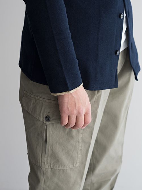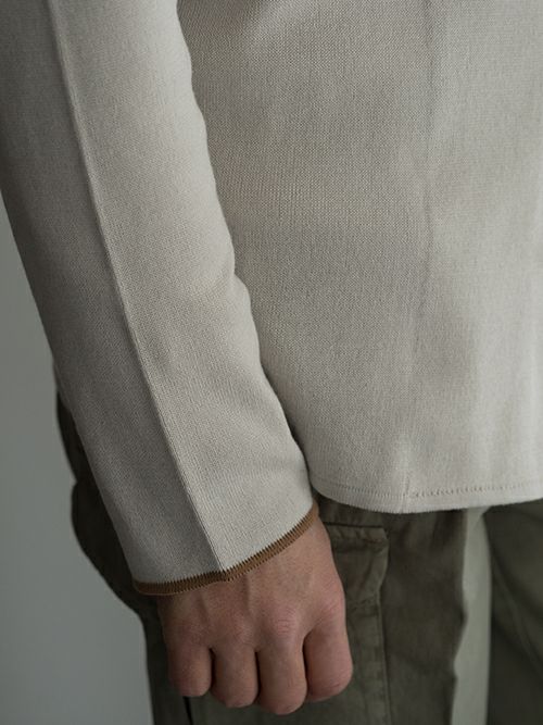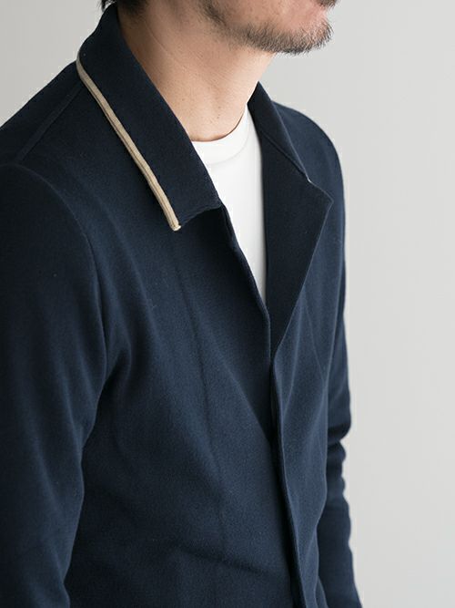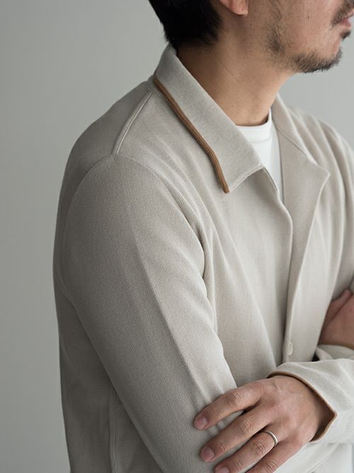 カーディガンやニットジャケットのような使い方ができ、春先のスタイリングに重宝する一着。襟、袖のバイカラーがアクセントになります。