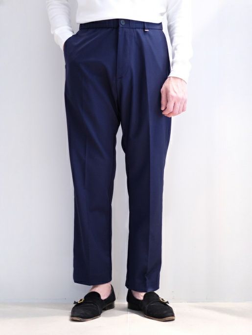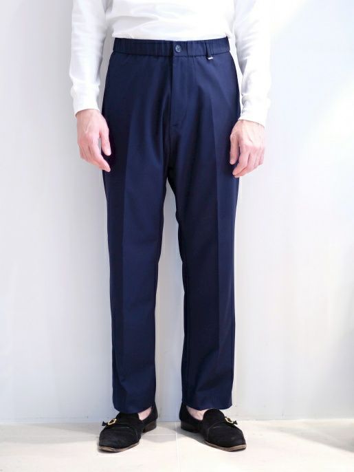 ゆとりのあるシルエットでリラックス感が魅力的なイージーパンツ。ノータックですが、比較的股上が深いデザインでヒップには余裕を持たせています。