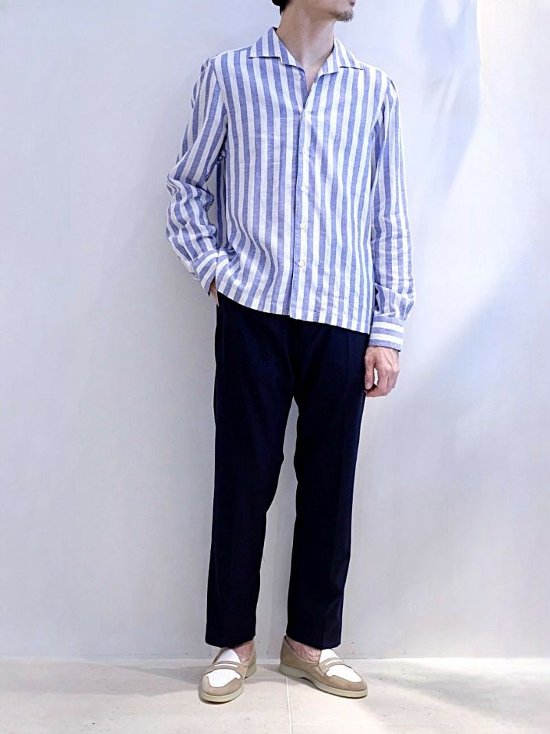 テーパードは緩やかに効かせてはいますが、どちらかというとストンと落ちたストレートに近いシルエット。こなれた雰囲気が洒落心をくすぐる一着です。