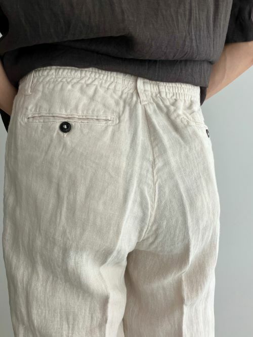 春夏に適したリネン生地。ワタリはやや広めにとったワンタックのテーパードパンツです。ドローコードによりウエストの調整が可能で、背面はシャーリング仕様でストレスフリーの着用感です。