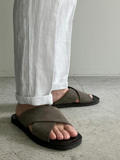 レザーのサンダルやスニーカーを足元に合わせると、上品なリラックス感を演出してくれます。