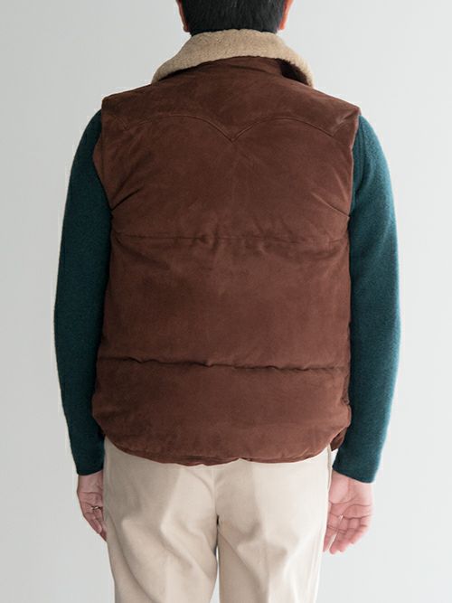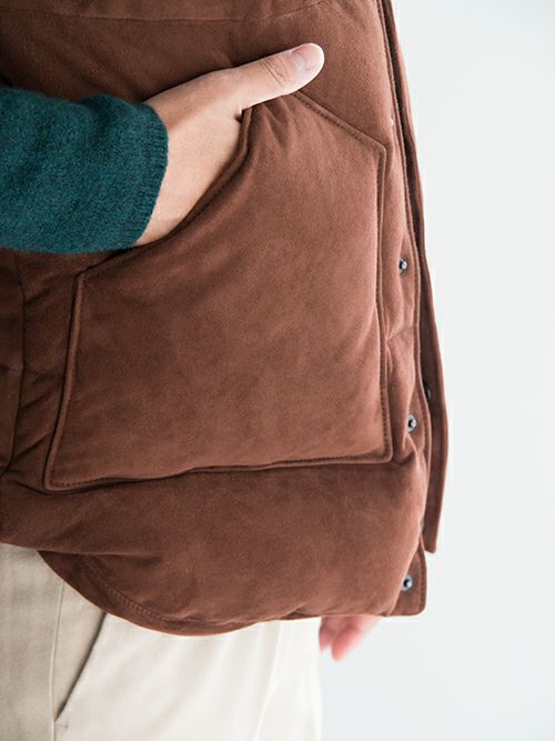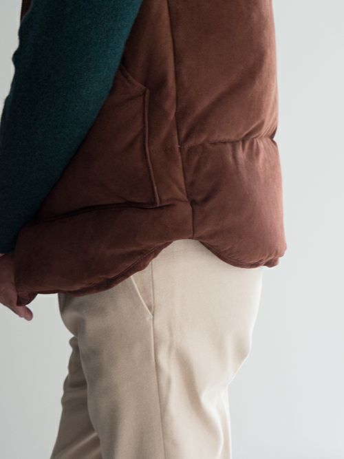 外側表面はラムレザーを使用し、中は高級グースダウンを使用したダウンベスト。保温性が高くボリュームのあるシルエットなので、インナーには薄手のセーターは勿論、厚手のセーターとのコーディネートもおススメです。