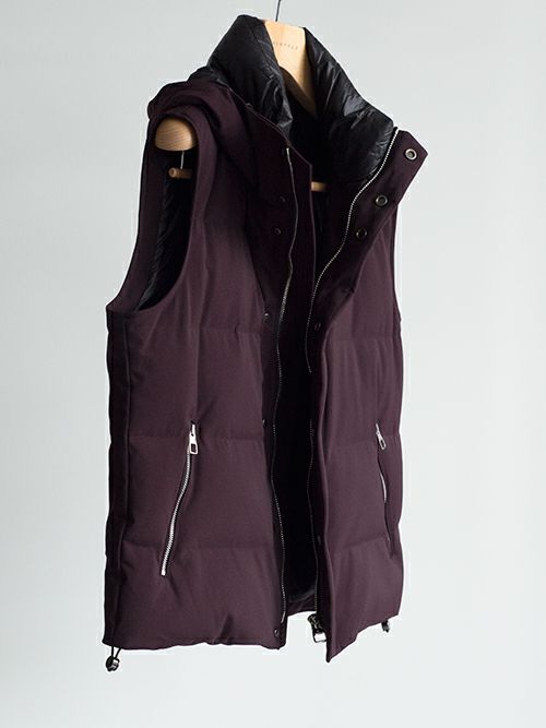 表地はストレッチ素材で着心地もよく、光沢のある生地感が上品なダウンベスト。シルバーメタルのパーツも上品な印象です。フードや裾部分にドローコードが施されており、フードの立ち上がりも調整することが可能。ニットやブルソンとのレイヤードもおすすめです。
