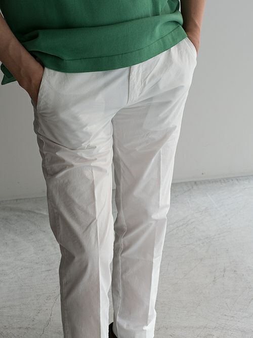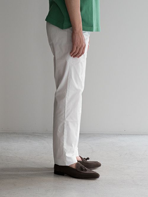 すっきりと見えるノータックのテーパードパンツですが、ウエストは少し余裕を持たせたサイジングになっており、ストレスなく綺麗なシルエットで着用いただけます。足元はローファーからスニーカーまで、振り幅広く合わせられるのでトップス選びも迷いません。