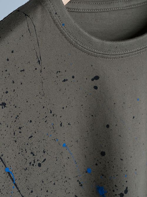 フロントに入るのは、筆でペンキを散らしたようなペイント柄。黒い箇所は染み込みプリントですが、青い箇所は少し立体感があり、エッジの効いた仕上がりです。