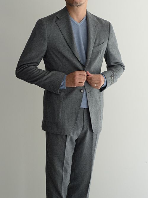 ノッチドラペル3つボタンの段返り、ポケットはバルカパッチ仕様。サイドベンツで一枚芯の軽快なジャケットに仕上げています。パンツは2タックのウエストはドローコードとベルトループの2WAY仕様です。