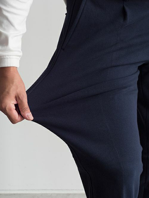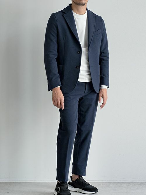 スウェット素材を使用したセットアップは数多くありますが、素材特性上、どうしても保形性に難があり、一日座り仕事をしていると肘や膝が抜けてしまってだらしなく見えてしまうなど、快適な素材であるが故のデメリットもありました。
