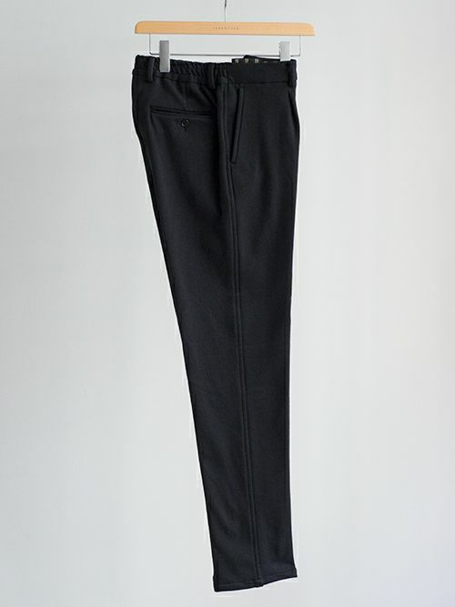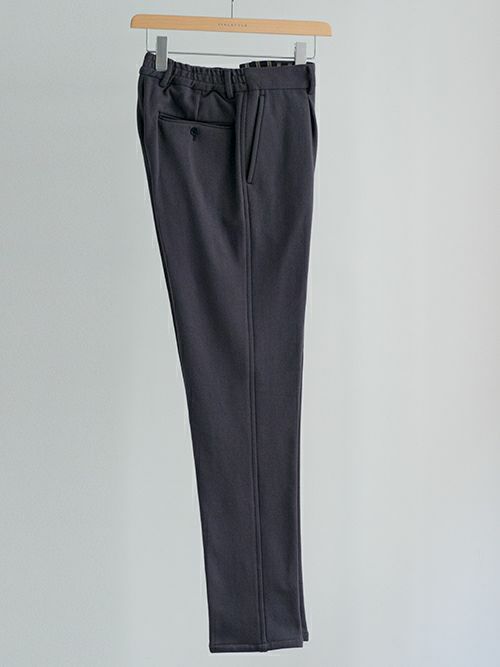 Lequalのこちらのセットアップは先ず生地からオリジナルで和歌山のニッターに生産を依頼。中糸にポリウレタン糸を入れ込んだカバーリング糸を極力度詰めして編み立てることで、非常にキックバックの強い素材となっています。