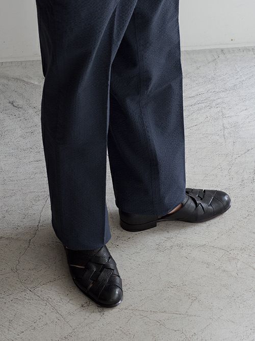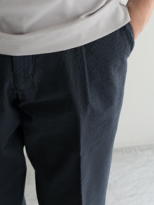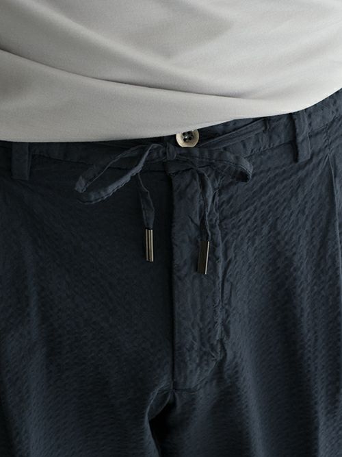 ワンタックで膝下からはストレートに近い、綺麗なシルエットのシアサッカーパンツ。ウエストの背面はゴム仕様で、フロントはドローコードを配しています。