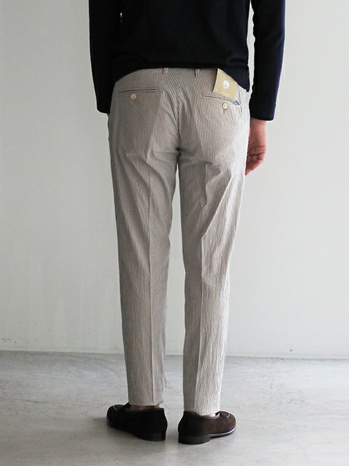 清涼感があり、春夏シーズンに適したシアサッカー素材のテーパードパンツです。