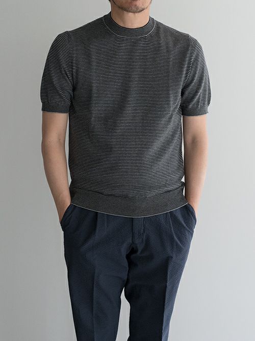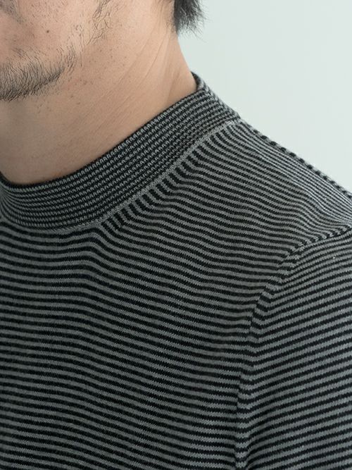 カジュアルな印象の強いボーダー柄ですが、ピッチを細くし、肩口のシルエットもすっきりとコンパクトにする事で、落ち着いた印象のボーダーニットに仕上がっています。カットソーの代わりに気軽に着ていただければ、カジュアル過ぎない大人のコーディネートを演出できます。