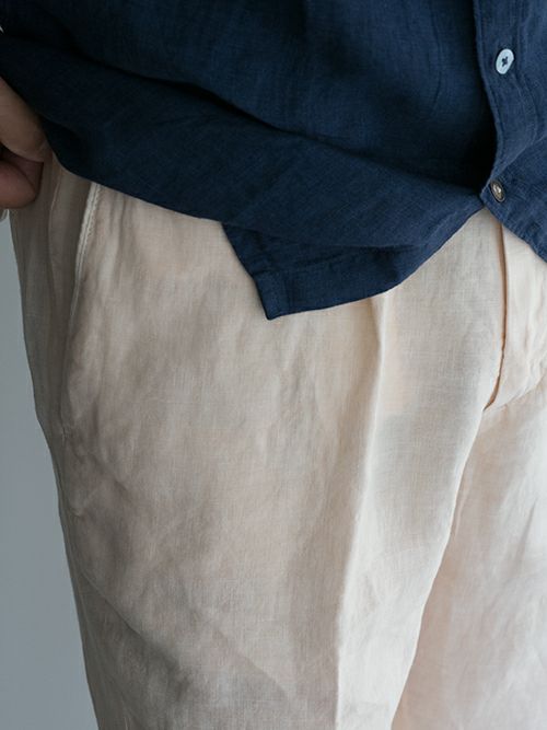 リネン生地のワンプリーツパンツ。ウエスト後ろはゴム仕様ですので、程よく腰回りにゆとりがあります。
