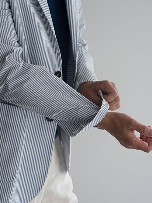 春夏シーズンに適したシアサッカー生地を使用したシングル2つ釦ジャケット。裏地なしの軽やかな着用感です。