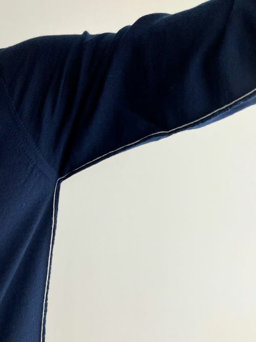 ステッチを敢えて際立たせたデザインが印象的で、一枚での着用から、インナーとしてもスタイリングのアクセントになる一着です。