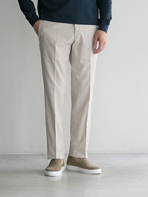 清涼感があり、春夏シーズンに適したコットン素材のテーパードパンツです。