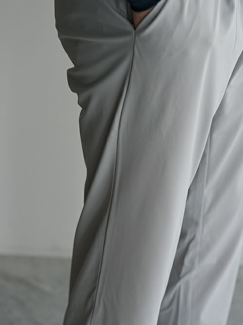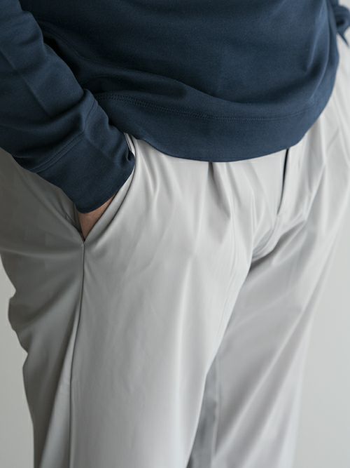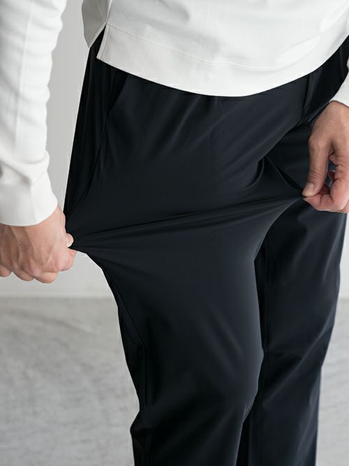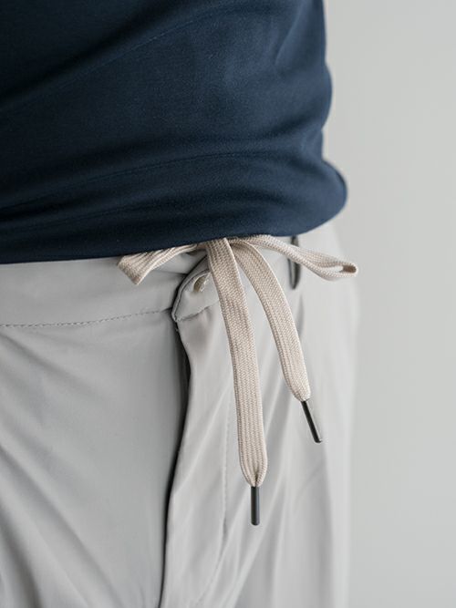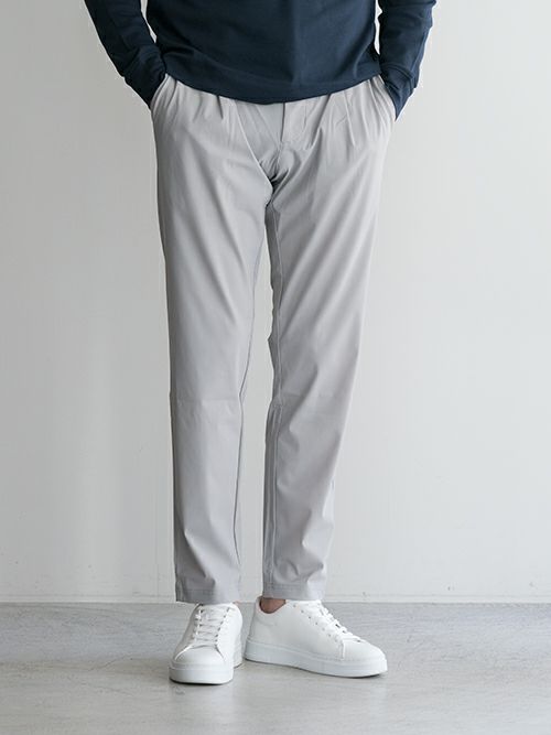ストレッチ混でゴムのように伸びが良いナイロンパンツ。履き心地の良さは言うまでもありませんが、上質な生地感と綺麗なテーパードシルエットにより、大人の上品さを損ないません。