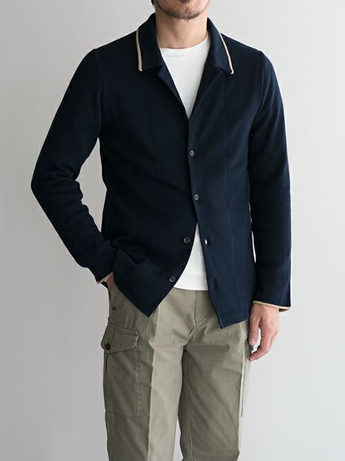 カーディガンやニットジャケットのような使い方ができ、春先のスタイリングに重宝する一着。襟、袖のバイカラーがアクセントになります。