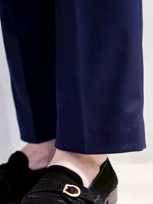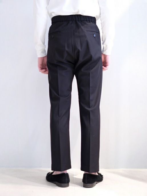 ゆとりのあるシルエットでリラックス感が魅力的なイージーパンツ。ノータックですが、比較的股上が深いデザインでヒップには余裕を持たせています。
