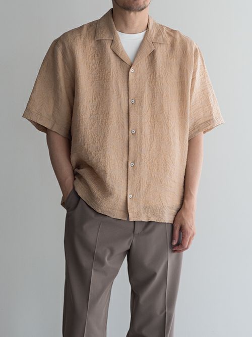 ゆとりのあるシルエットでリラックス感のあるオープンカラーシャツ。エンボス加工によって表現されたリーフ柄が魅力的です。デザイン性の高さもさることながら、肌触りの良いサラッとした生地感も魅力のひとつです。