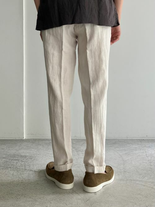 春夏に適したリネン生地。ワタリはやや広めにとったワンタックのテーパードパンツです。ドローコードによりウエストの調整が可能で、背面はシャーリング仕様でストレスフリーの着用感です。