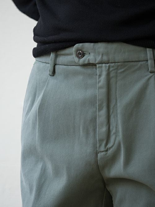 1プリーツのリラックスフィットモデルBLEECKER、カーキのテンセル×コットン素材を使用した一着。
