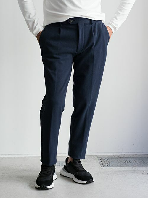 Lequalのこちらのセットアップは先ず生地からオリジナルで和歌山のニッターに生産を依頼。中糸にポリウレタン糸を入れ込んだカバーリング糸を極力度詰めして編み立てることで、非常にキックバックの強い素材となっています。