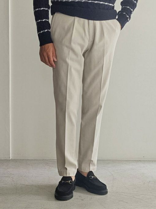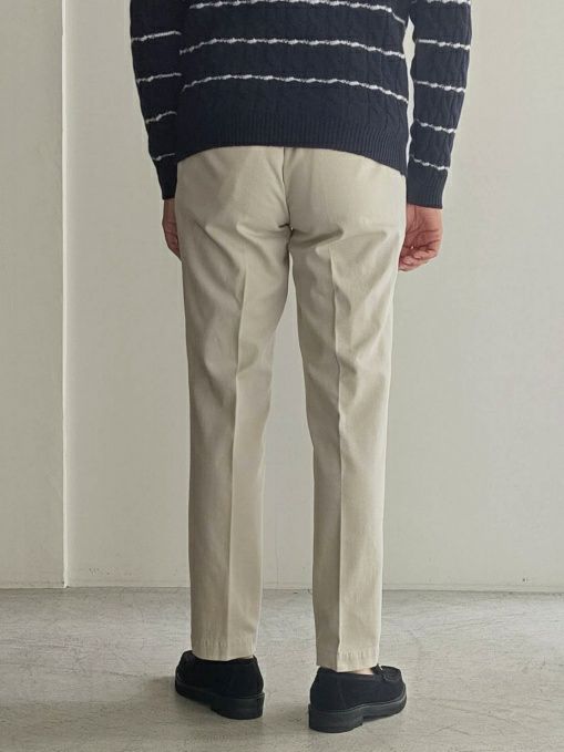 しっかりとしたコットン生地を使用したワンプリーツパンツ。全体的にゆとりのあるテーパードシルエットです。ウエストの背面はシャーリング仕様なのでサイズの微調整が可能。今のトレンドを上品に取り入れた大人のイージーパンツです。