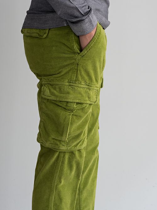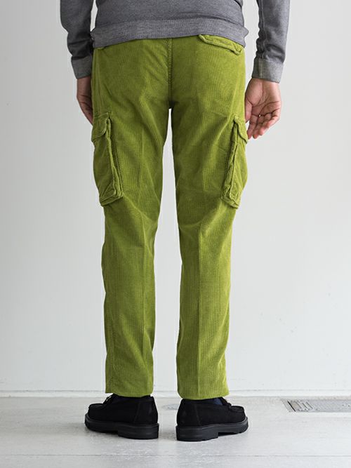 秋冬らしいコーデュロイ生地で、いわゆるドレスカーゴと言われるモデル。ノータックで股上も比較的浅く、全体的に細めのテーパードシルエットです。