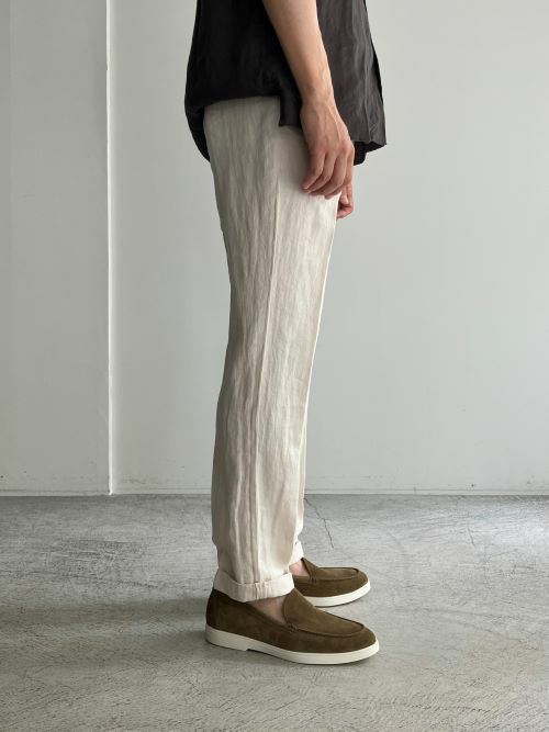 春夏に適したリネン生地。ワタリはやや広めにとったワンタックのテーパードパンツです。ドローコードによりウエストの調整が可能で、背面はシャーリング仕様でストレスフリーの着用感です。