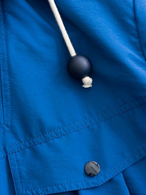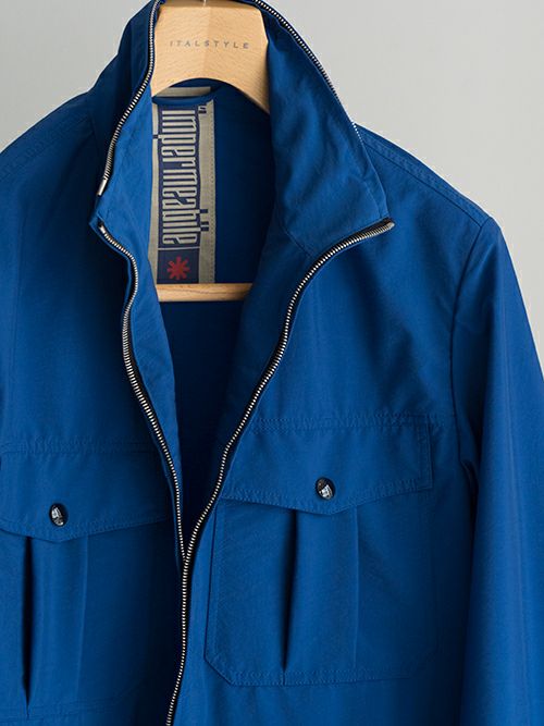 鮮やかなブルーが目を惹くミリタリーアウター。ナイロンとポリエステルの混生地で裏地は付いておらず、軽やかな羽織り心地です。