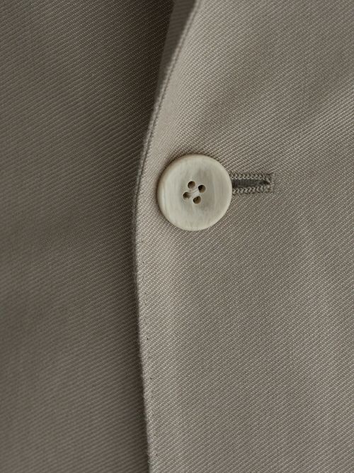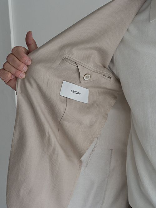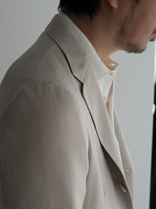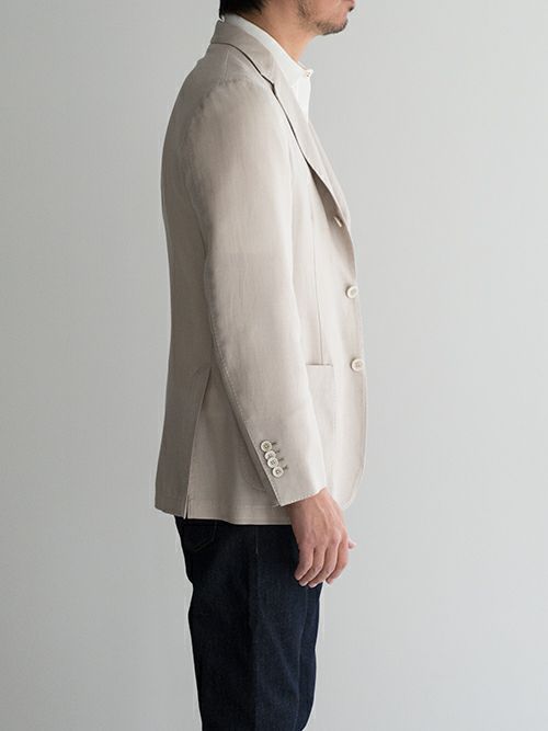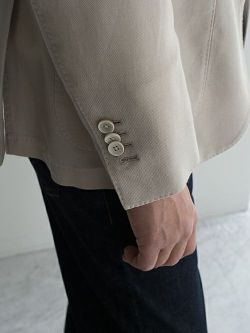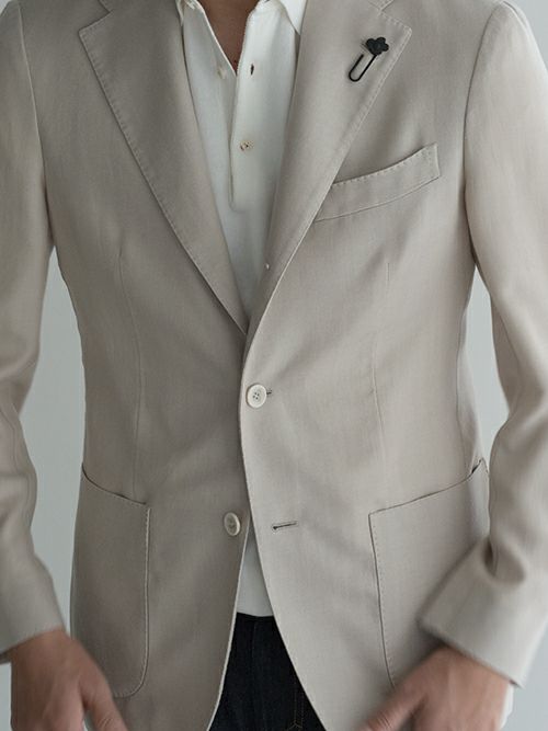 3つ釦の段返りでノッチドラペルにフロントのパッチポケット、そしてサイドベンツのカジュアルジャケット。シンプルなディテールが生地の上質さと仕立ての良さを際立たせており、ブランドアイコンでもあるブートニエールがその名の通り花を添えます。