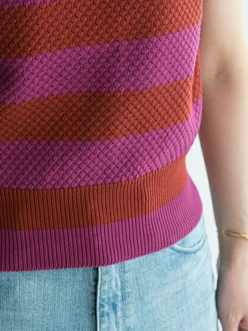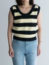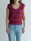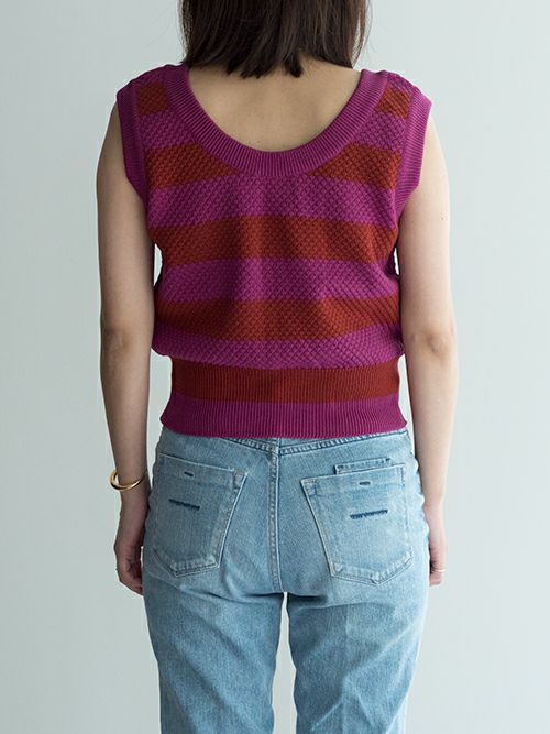 少しショート丈のノースリーブニット。1枚で着ても存在感のある太めのボーダー柄です。カットソーなどと重ねて、ベストのように合わせても雰囲気良く着こなしていただける一着。ネック部分の開き感も、女性らしく綺麗に見せてくれます。スカートやワイドパンツと相性が良く、またジャケットのインとしても活躍する汎用性の高さも魅力。