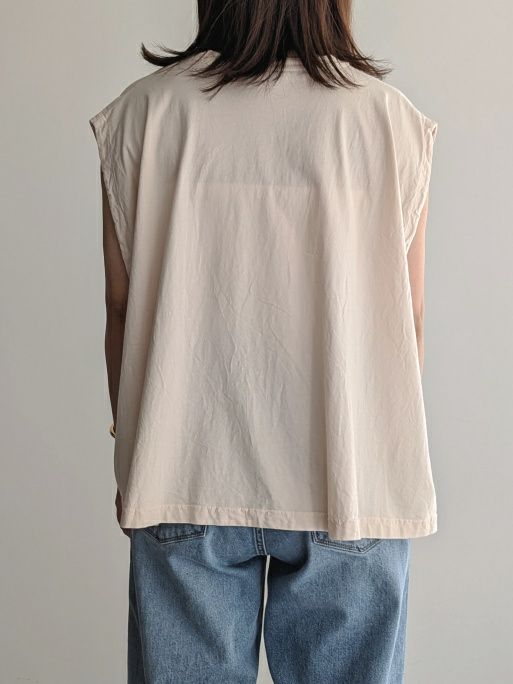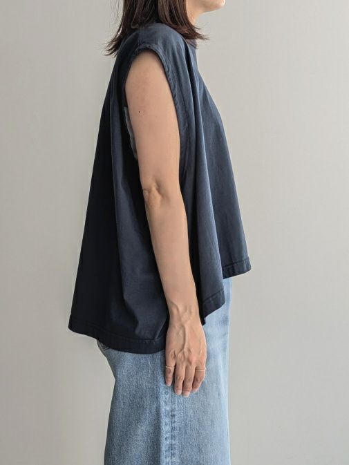 コットン100%のノースリーブワイドカットソー。全体的に横にゆとりを持たせて前見頃を短めにしたデザインカットソーです。肌触りも柔らかく程よく馴染んでくれます。短めの着丈ですのでワイドなパンツやスカートなどのボトムもバランスよく着用いただけます。スリーブは広めですのはインナーは必要です。ネイビー以外は多少の透け感がございます。