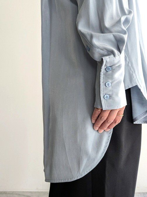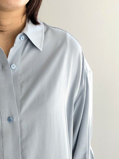 経糸と緯糸を配色にすることで生地表面の見え方に変化をつけたツイルシャンブレーシャツ。表と裏の配色が特徴的で、光沢感と滑らかなドレープ感が立体的な動き演出してくれます。オーバーサイズのドレープシャツは、とろみ感のある素材で上品で女性らしい印象になります。