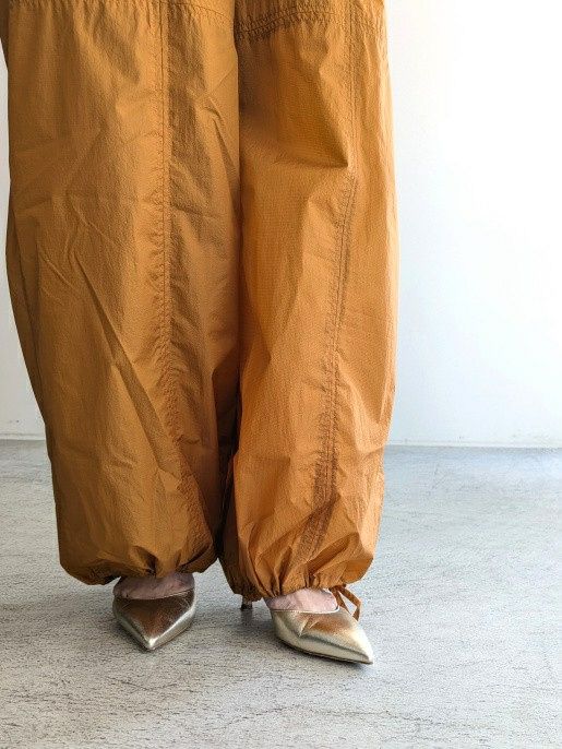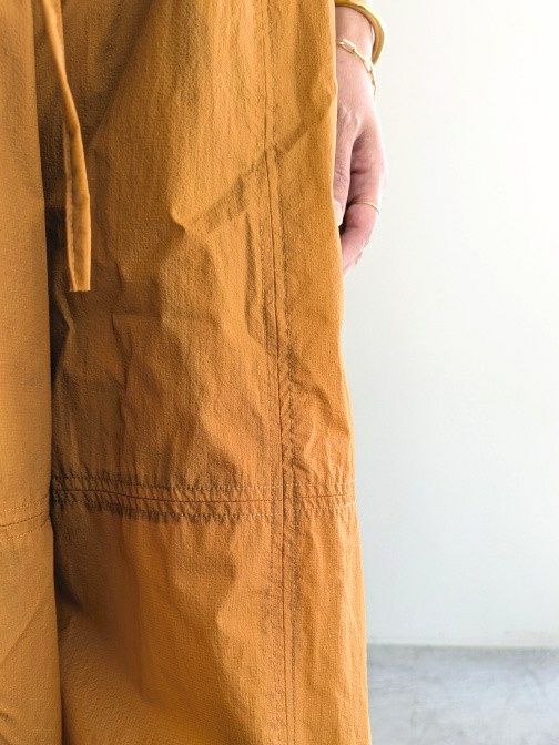 細い糸と太い糸を練り込むことで引き裂けを防ぐ強度でありながら、軽さを追求したリップストップ生地をセレクトしています。程よい透け感が特徴的なアウトドア素材で、ウエストのドーロストリングでシルエットを変化させたり、上部を垂らしてワイドパンツとしても着用可能。切り替えデザインと素材感が程よくカジュアルな印象になります。