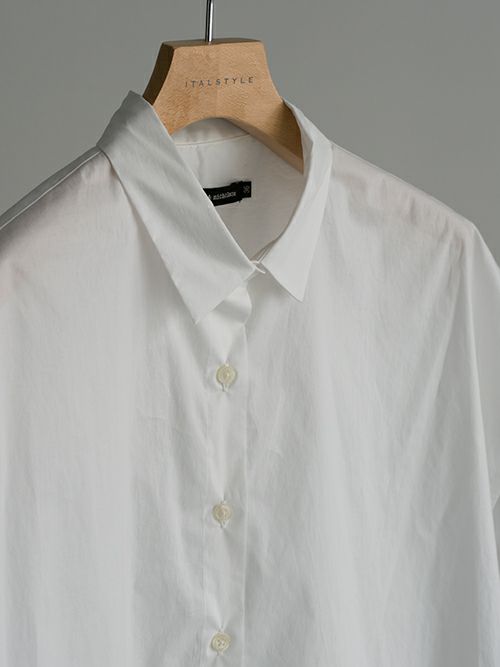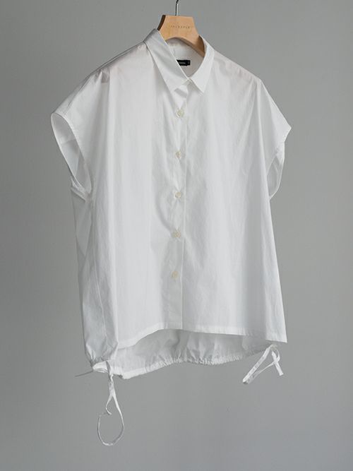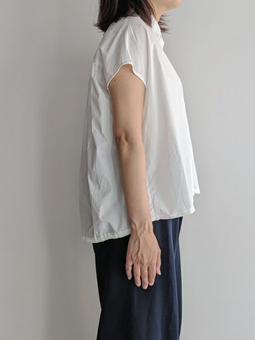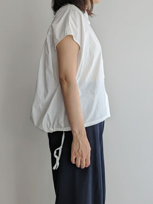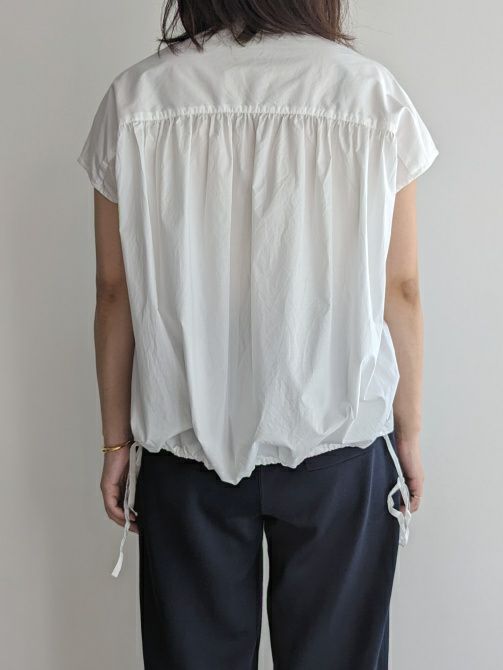 ヨークから細かなギャザーを施し、フェミニンな印象に。後ろ側の裾紐を絞ることでシルエットにアレンジをつける事が出来るので、あわせるボトムスでいろんなスタイルを楽しめます。
