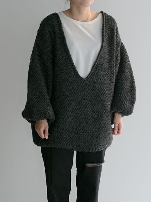 ざっくりとボリュームのある袖とVネックの抜け感のバランスが絶妙なニットです。英国羊毛を使った手つむぎ風のスラブヤーンを使用しており、保湿効果が高く、柔らかい女性らしいシルエットの1枚です。