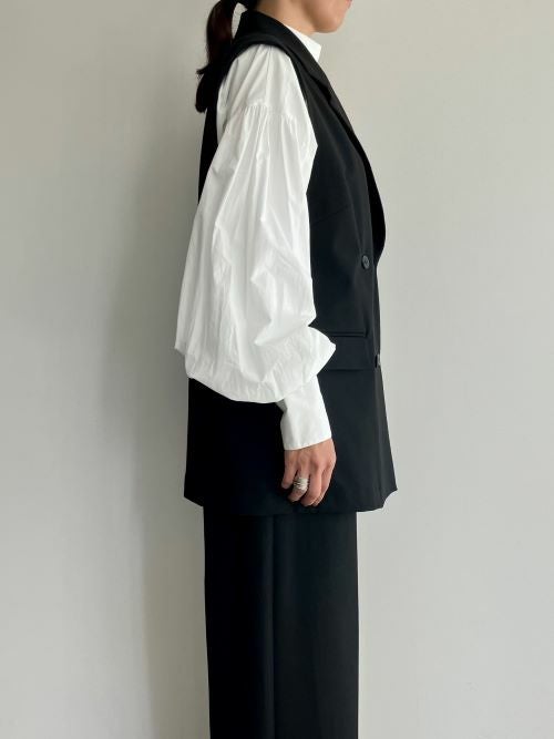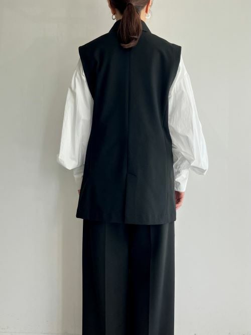オーバーサイズではなく、適度なゆとりのあるスッキリしたシルエットです。程よい肉感のポリエステルとレーヨン素材なので、晩夏から長く着用できるアイテムです。生地感はソフトでふんわりしており普段使いはもちろん、オケージョンやオフィスなどでも活躍するジレです。