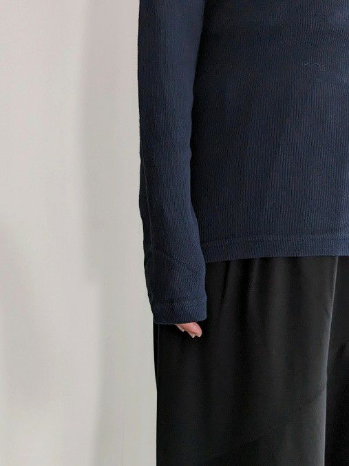 コットン100%のリブクルーネックカットソー。全体的にインナーようにタイトなサイジングにしてありますが、肌触りも柔らかく程よく馴染んでくれます。着丈は長めになっていますのでボトムにインして頂くとスッキリと着用頂けます。ネック部分は開きすぎず程よいネックの開き感です。ホワイトは多少の透け感がございます。シャツワンピースやニットカーディガンのインナーに活躍するアイテムです。