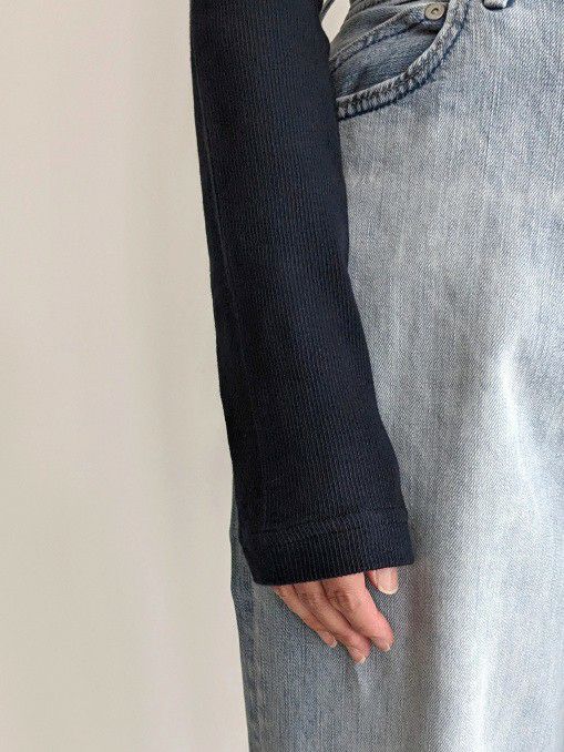 コットン100%のリブタートルネックカットソー。全体的にインナー用のタイトなサイジングにしてありますが、肌触りも柔らかく程よく馴染んでくれます。着丈は長めになっていますので、ボトムにインして頂くとスッキリと着用頂けます。