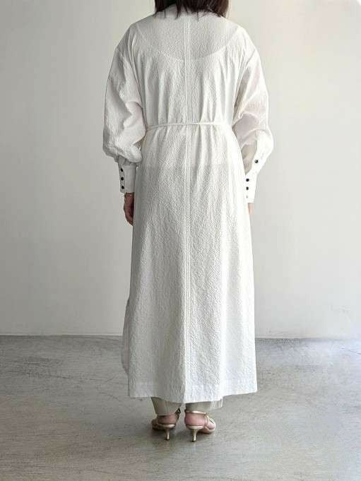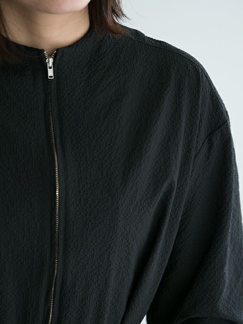 収縮率の違う縦糸と横糸を使用し、泡のような立体感のある風合いを出した素材をセレクトしています。機能性を併せ持ち、通気性のある柔らかい一着です。フロントのジップ仕様がスポーティーな印象ながらも、ウエストベルトでブラウジングすると女性らしいスタイリングも楽しめます。また、ジップを開けてインナーと合わせたレイヤードスタイルもオススメです。