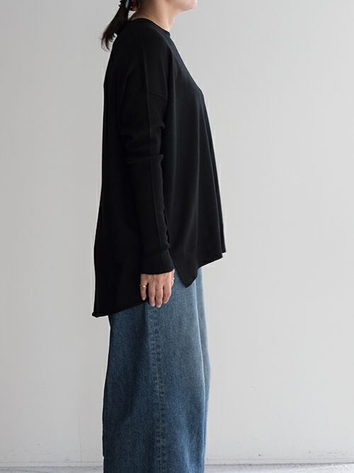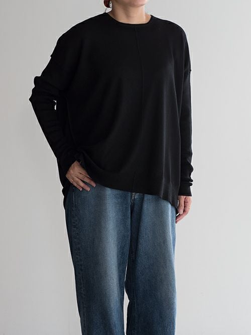 ゆとりのある身幅でリラックス感がありながらも、身体にそっと寄り添う美しいラインお演出。袖口はリブ仕様で程よくフィットし、重ね着してももたつかず、秋冬のレイヤードにもぴったり。ベーシックなカラー展開で、どんなアイテムとも好相性。ワイドパンツで抜け感を出したり、テーパードパンツでシャープにまとめたりと、スタイリングの幅が広がる万能トップスです。