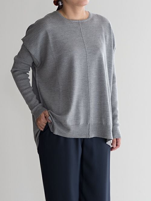 しっとりした肌触りのウール100%を使用したハイゲージのクルーネックニット。ドロップショルダーに加え、存在感のあるリブ袖がさり気なく個性を添えます。あえてリバースシームを施すことで、上品な素材感にカジュアルなエッセンスをプラス。抜け感のあるデザインに仕上げました。