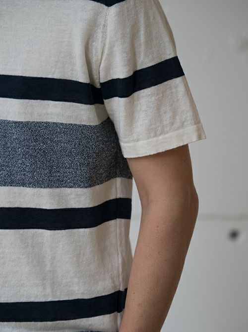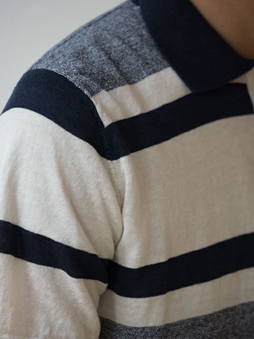 マルチボーダーですが、ネイビーとオフホワイトのカラーリングが品の良さを演出、1枚でのスタイリングに最適なニットポロです。
