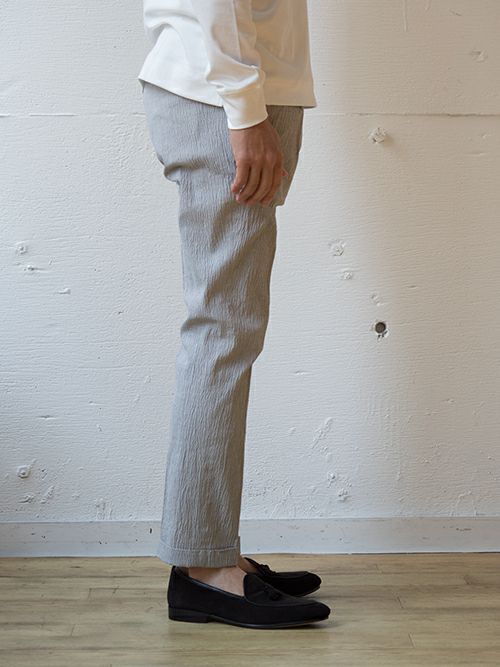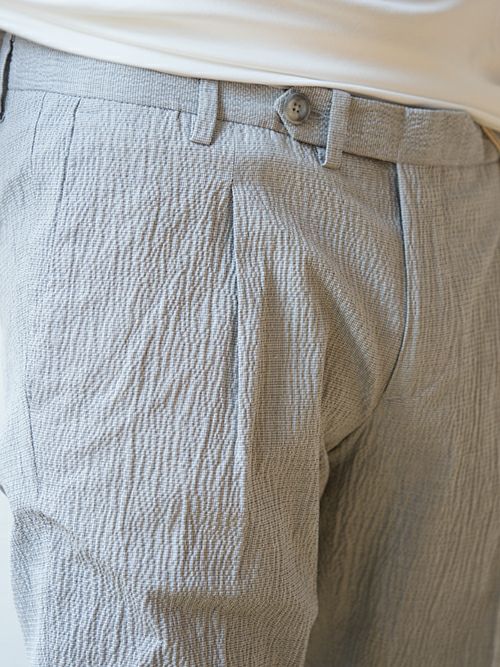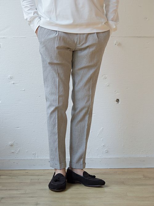 1プリーツのテーパードスリムフィットで、クロップ丈がスタイリッシュな印象。