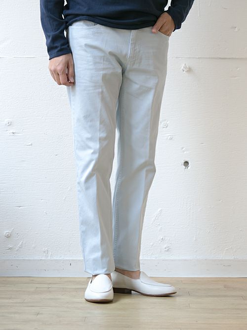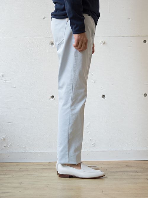 細すぎない適度なストレートシルエットが魅力的。これからのシーズンに最適なサックスブルー、ソフトタッチなストレッチ素材で、履き心地にも優れた一着です。