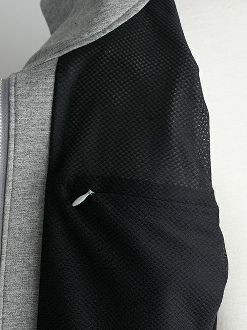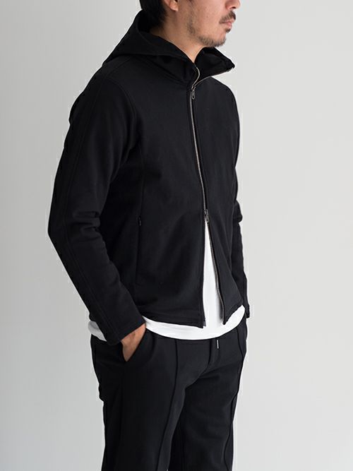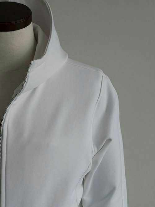 特殊な工程で縫製しており、着心地とシルエットに拘った一枚。綿裏毛にストレッチ糸を入れ込んで編んでおり、背面肩口と脇下両サイドにテレコ素材のリブをプラスする事で可動域が格段に広がります。