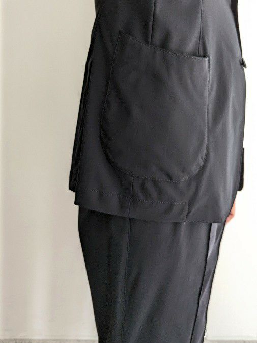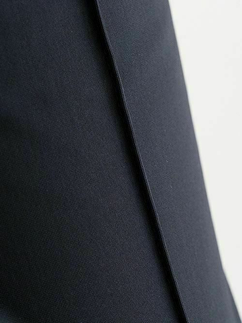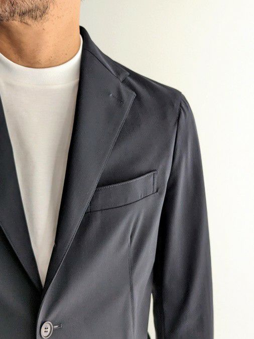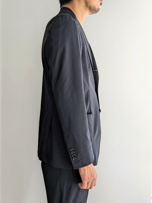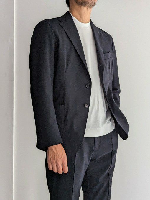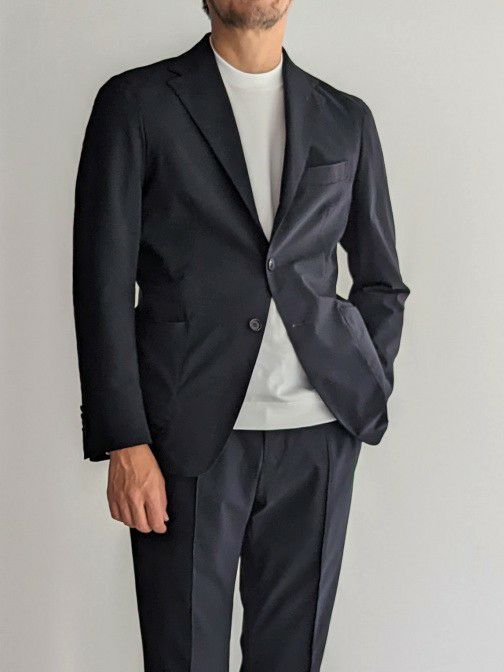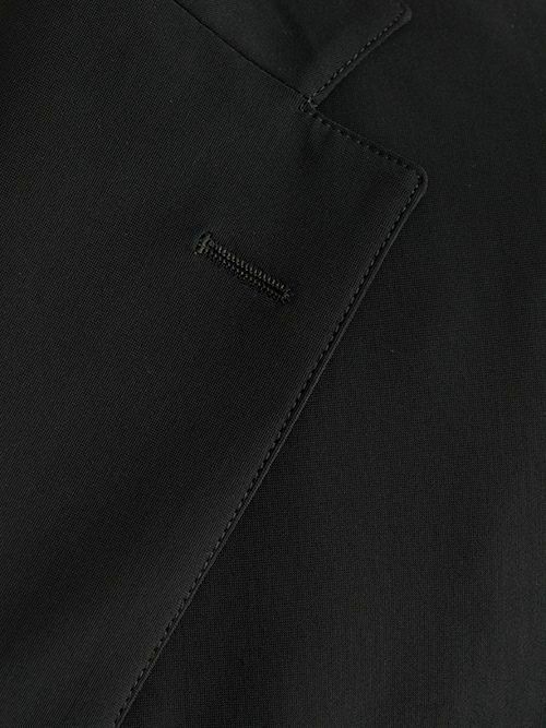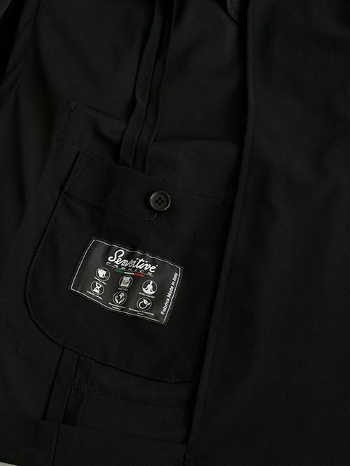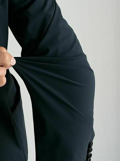 イタリアでは珍しい、ジャージー専業サプライヤーであるEURO JERSEY社の特許取得素材である“SENSITIVE“と名付けられた生地を使用したスーツ。この生地は極細ナイロンとライクラを結束したもの(混率表記はナイロン72%、ポリウレタン28%)で、強い耐久性と物質安定性と回復力にも優れ、また、UVカットで防シワ性と大変機能性に優れた一着です。