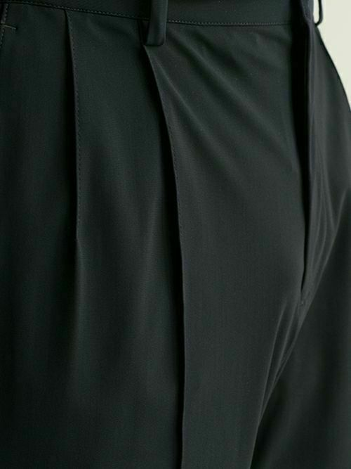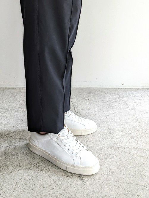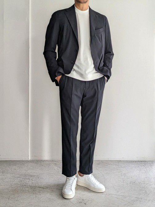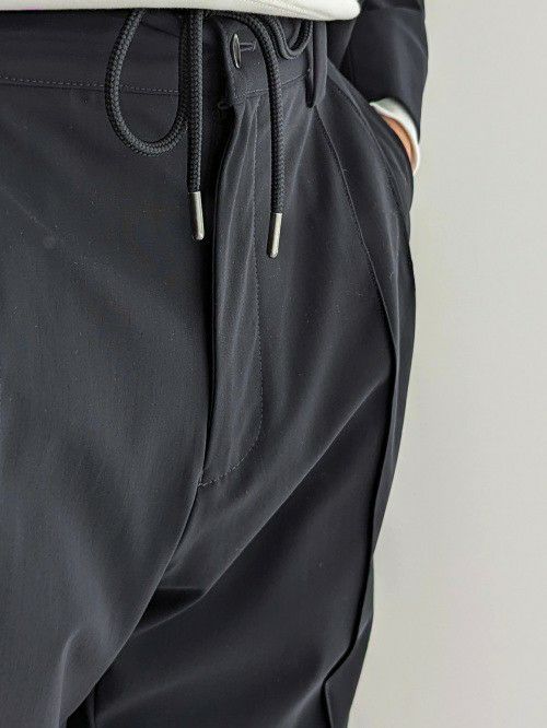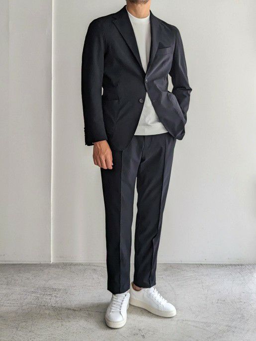 ノッチドラペル3つボタンの段返り、ポケットはバルカパッチ仕様。サイドベンツで一枚芯の軽快なジャケットに仕上げています。パンツは2タックのウエストはドローコードとベルトループの2WAY仕様です。
