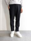 ウエストはシャーリング仕様でドローコードが内蔵。ベルトループもついており、ベルトの着用も可能です。バックポケットは片玉縁で、スウェットパンツでありながら、どこかドレッシーな雰囲気を纏った一着に仕上がりました。